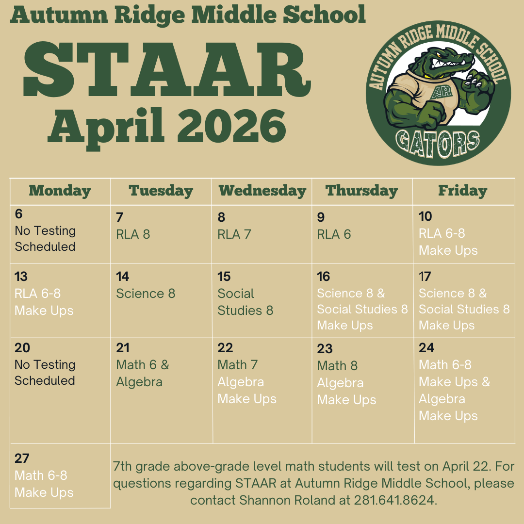 08- STAAR RLA 7 09- STAAR RLA 6 14- STAAR Science 8 15- STAAR Social Studies 8 18- Spirit Night at Sonic! 21- STAAR Math 6 and STAAR Algebra 22- STAAR Math 7 23- STAAR Math 8 24- Volunteer (PTO) Appreciation Day! 28- School Bus Driver Appreciation Day