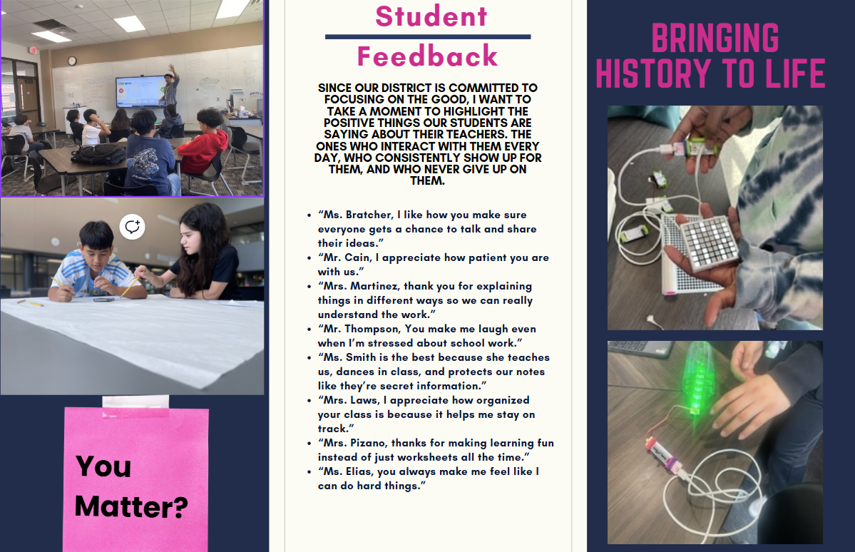 March 3-6- Diagnostician Appreciation Week! March 16-20- Spring Break Late Arrival-March 12th, 26th April 01- Paraprofessional Appreciation Day! 02- School Librarian Appreciation Day! 03- No School- Good Friday Holiday! 07- STAAR RLA 8