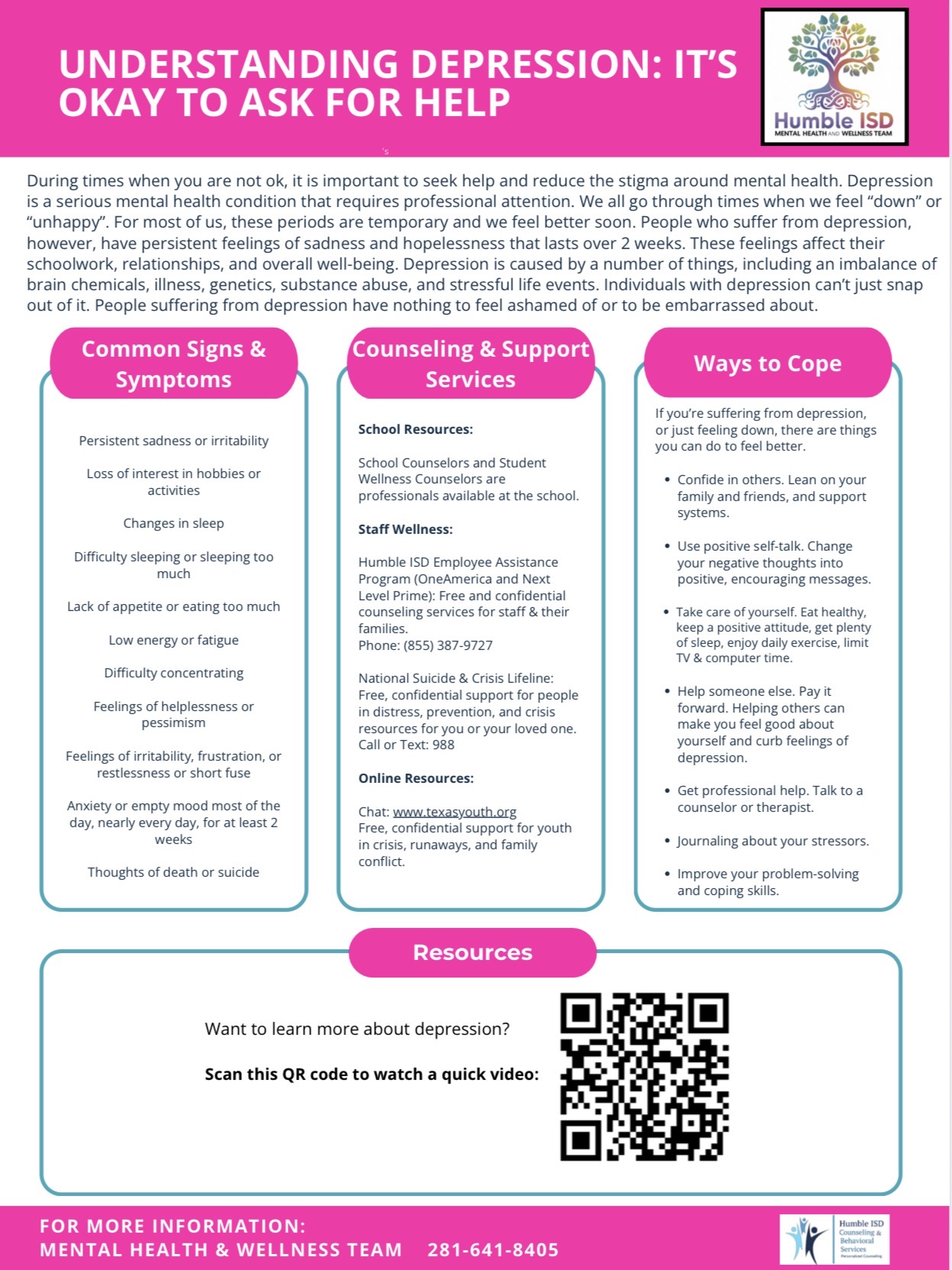 Humble ISD Counseling & Behavioral Services Website with information about our counseling program, the district's Wellness Counselors, and Community Resources. |