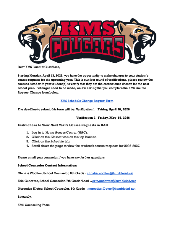 Contact: Christie Wootton (KMS Counselor) – christie.wootton@humbleisd.net