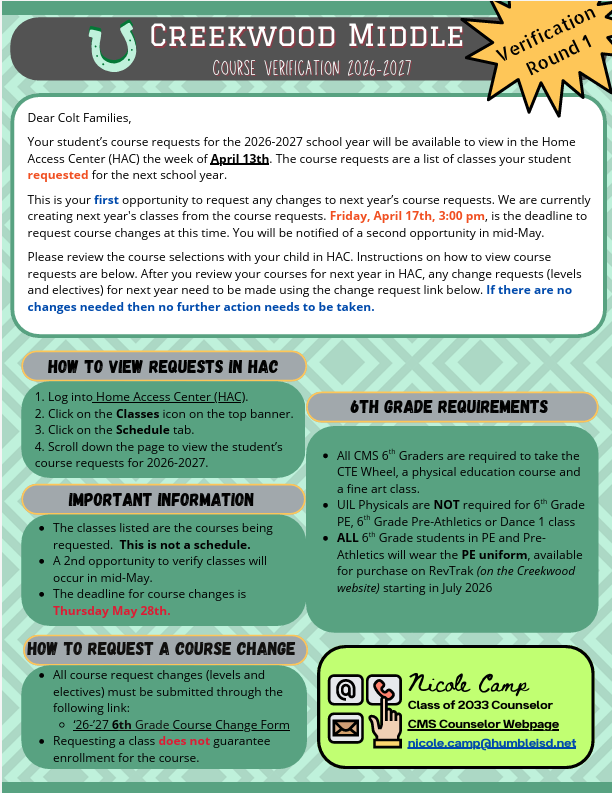 Many of you have already reviewed potential courses with your students in SchooLinks. April 13th marked the official start of Middle School Course Verifications in Home Access Center (HAC).