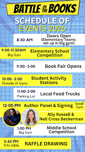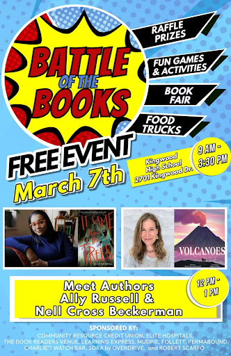 You can also meet Battle of the Books authors Nell Cross Beckerman (Volcanoes) and Ally Russell (It Came From the Trees) from 12pm - 1pm.  Local Food trucks will be on hand as well as a book fair, tons of FUN activities, and even a raffle for an eReader, gift cards to local businesses and more.