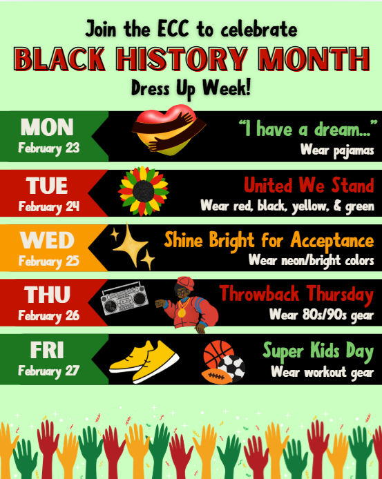 Get ready for a week of color, creativity, and celebration! Join us for Dress-Up Week as we honor Black History Month—each day brings a new theme inspired by amazing leaders, culture, and stories that shaped our world. Let’s learn, celebrate, and shine together! Monday- I have a Dream: Wear PJ's Tuesday- United We Stand: Wear black, red, yellow, and green