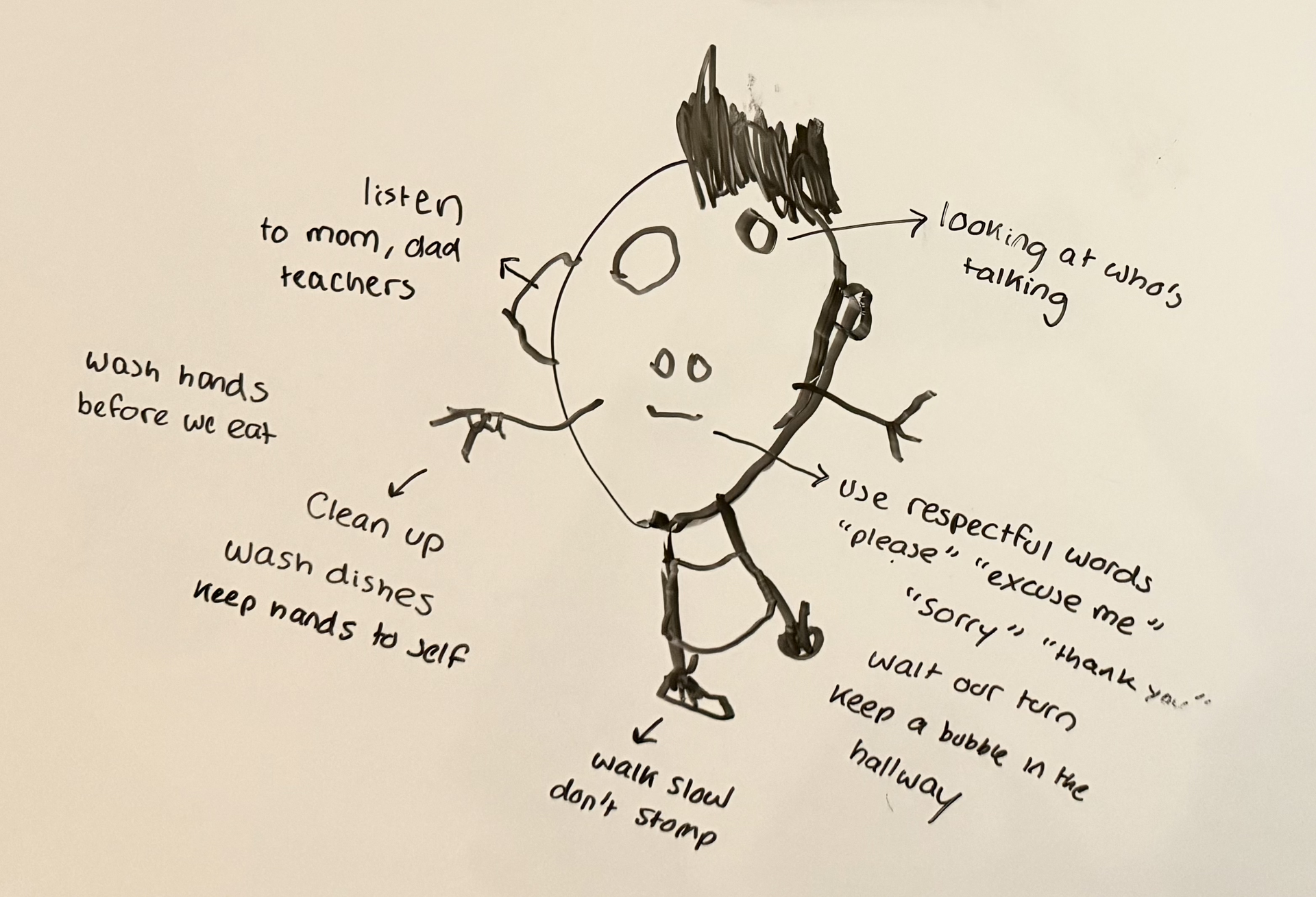 After drawing a self-portrait, students brainstormed ways they can be respectful and kind with different parts of their bodies! |