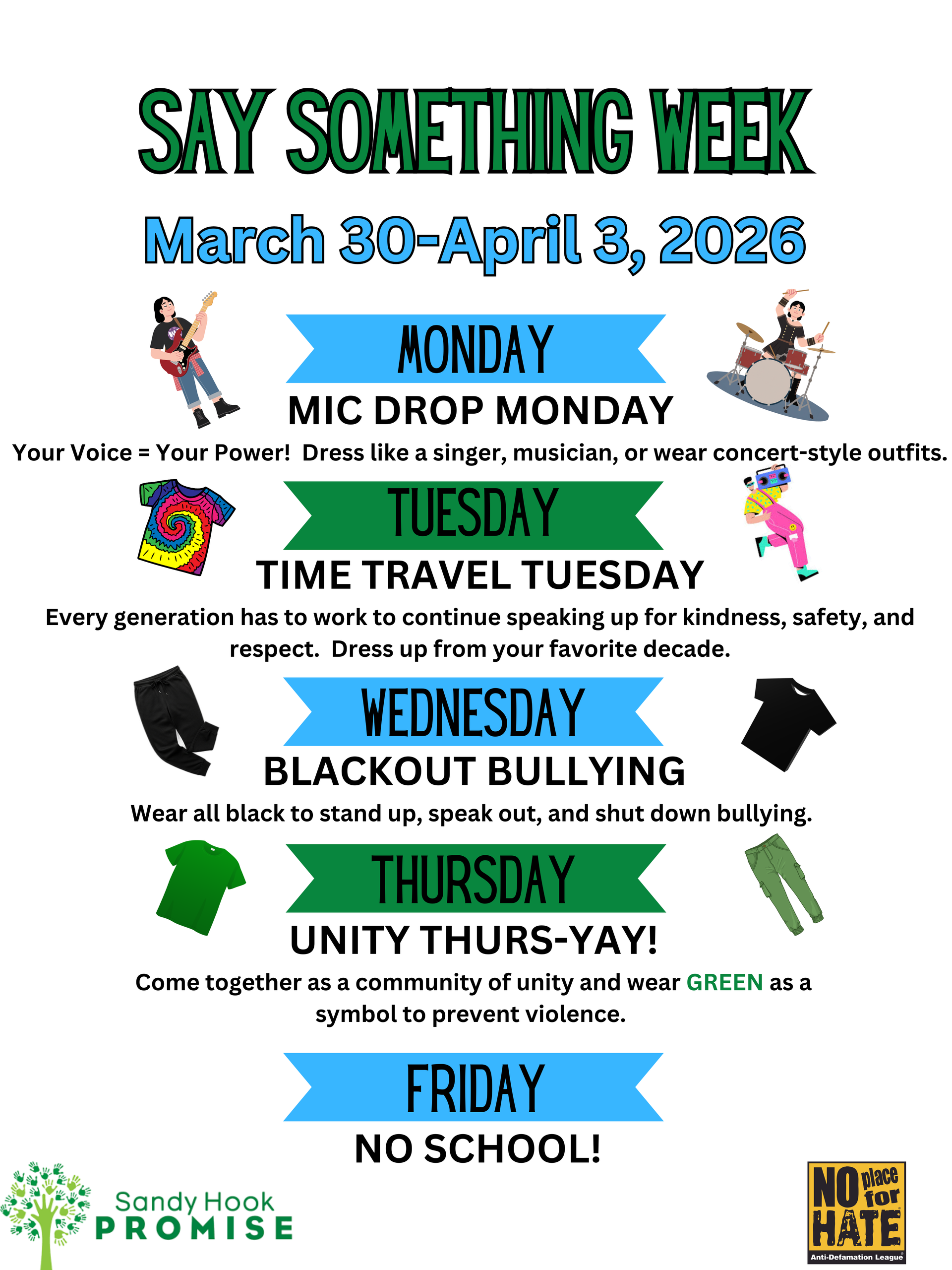 The Counselors are inviting students and staff to participate in Say Something Week, taking place March 30 through April 3, 2026. This meaningful week encourages everyone to use their voice to promote kindness, safety, and respect while building a stronger, more connected school community.