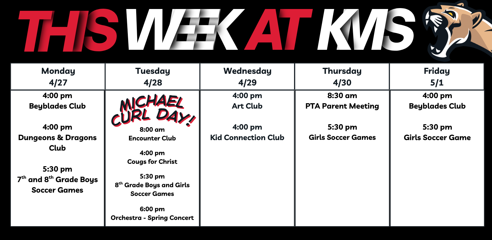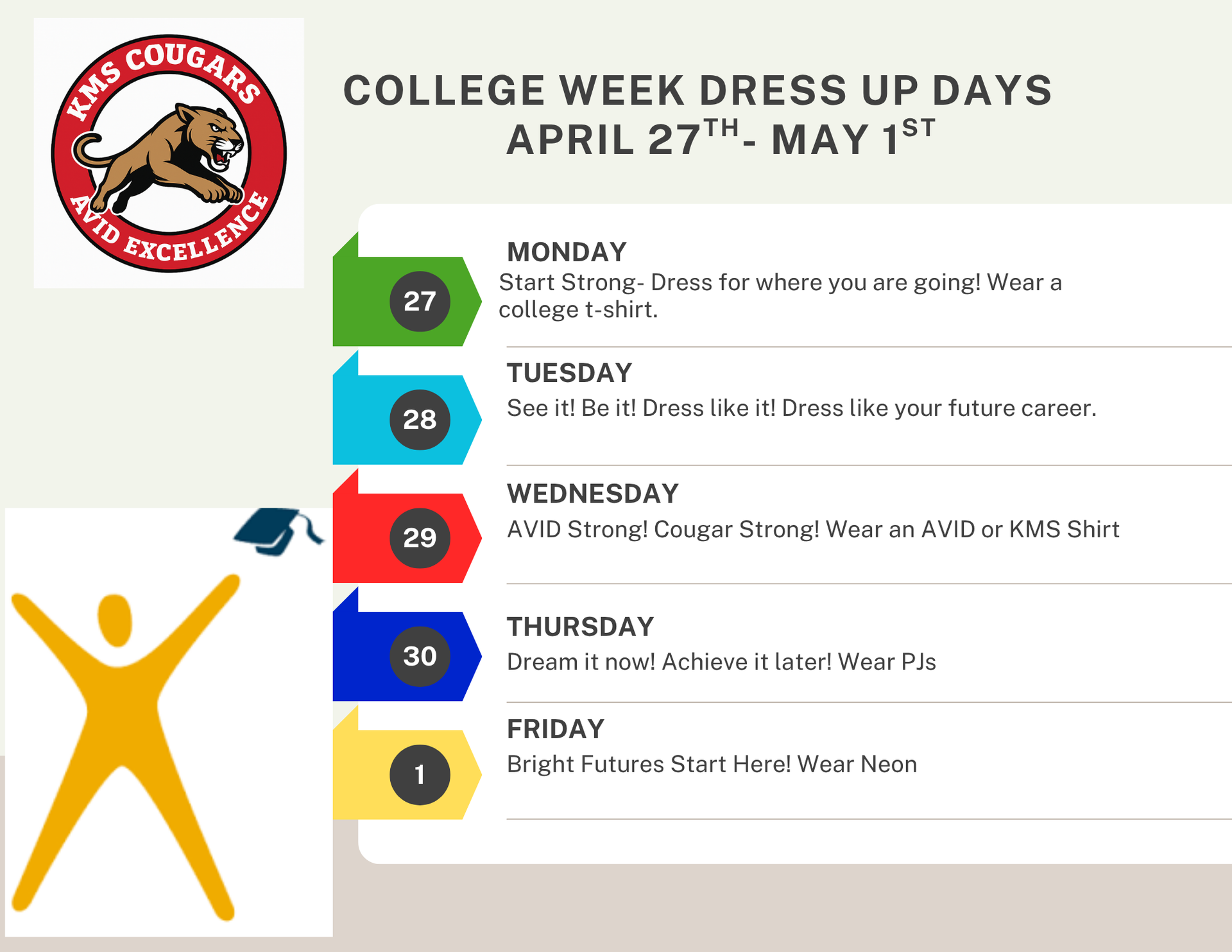 AVID's College Week is coming to KMS April 27 – May 1. Show up ready for your future. Big dreams start here, so let’s see what you’ve got! |