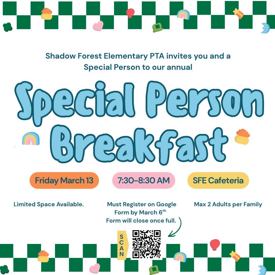 Hey Sharks! Invite a special person (grandparent, parent, etc.) to come enjoy a special breakfast with you. The PTA is sponsoring our annual Special Person Breakfast on March 13th from 7:30-8:30am. Spots are limited! RSVP today!