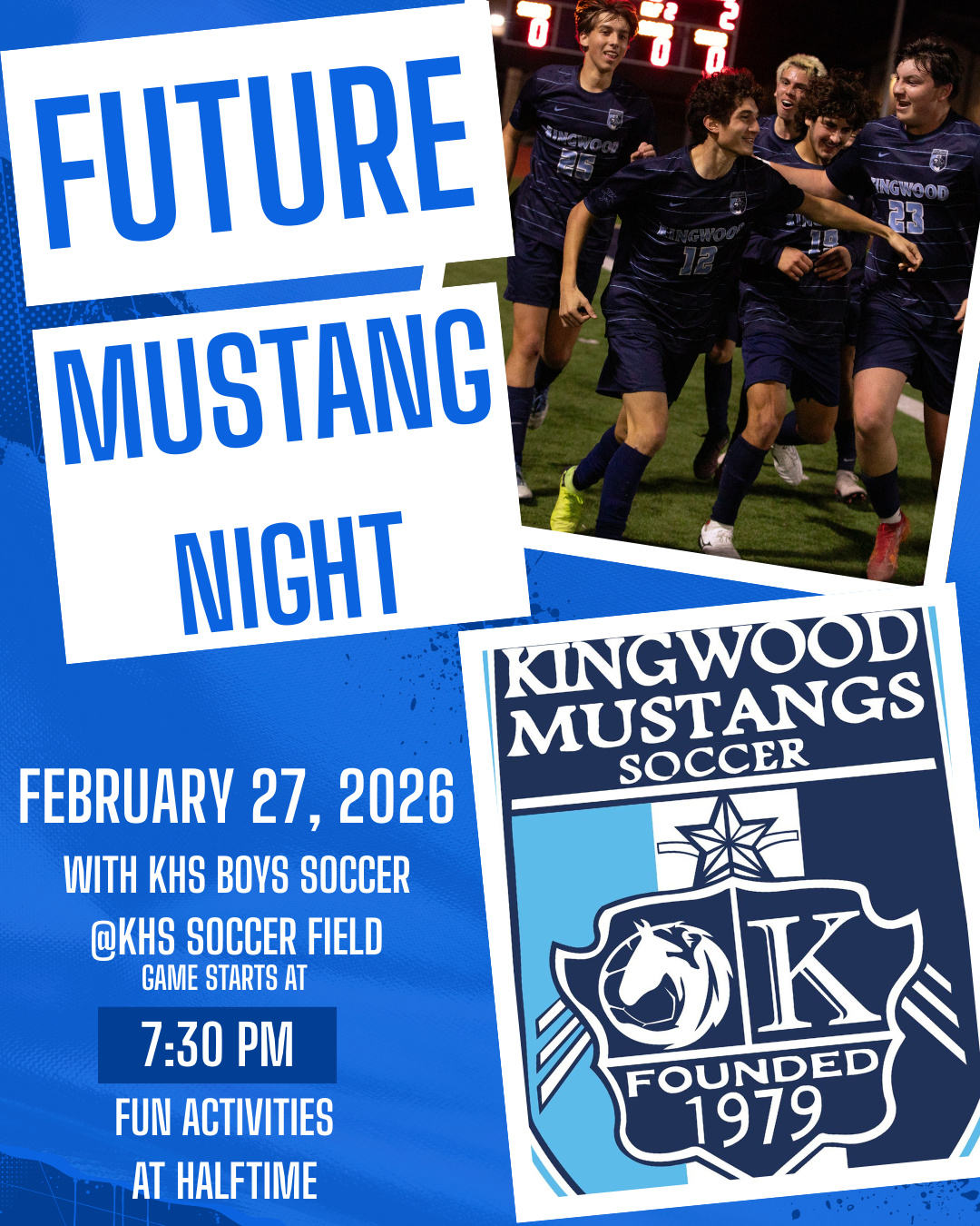 The KHS Boys Soccer program would like to invite all of our Future Mustangs to our Varsity game on February 27, 2026. The game starts at 7:30 PM with some fun giveaways and activities at half time. We hope to see you there!