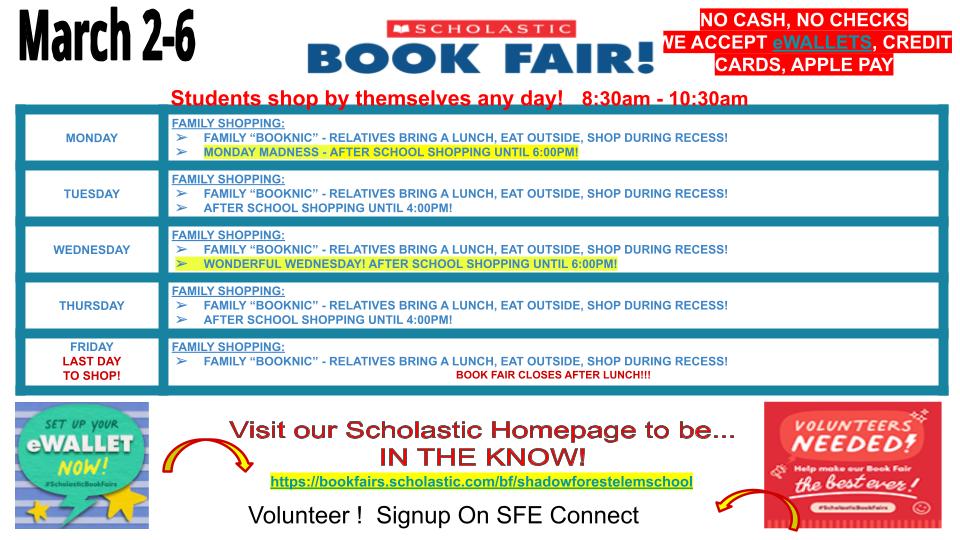 It is Book Fair time at SFE! The Book Fair will run March 2-6. The links below will help you sign up to volunteer, set up student eWallets, and look at family shopping events! Thank you for your support!
