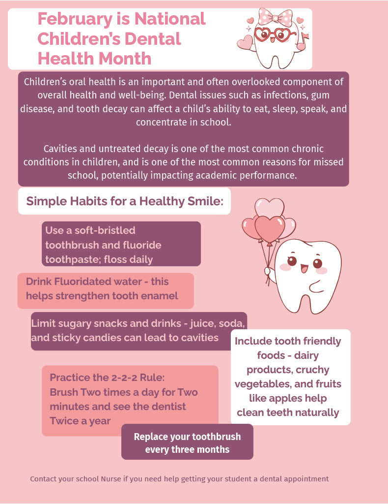 Bright Smiles Start Early! Although February is National Children's Dental Month, it is important every month to support children in developing healthy oral hygiene. Healthy teeth help kids feel confident, speak clearly, and enjoy their favorite foods. That's why building good dental habits early is so important. Encourage your child to brush twice a day with fluoride toothpaste, floss daily, and visit the dentist twice a year.