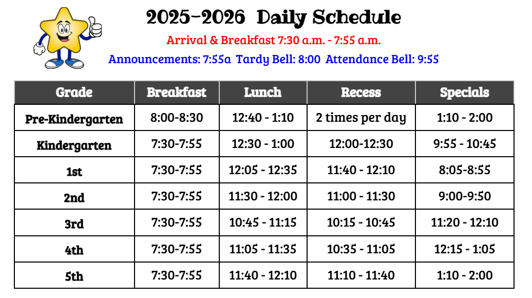 *Breakfast Served 7:30-7:55 If your child plans to eat breakfast, we recommend arriving by 7:40 to give them time to eat their meal and be ready for class.